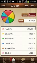 Based on the data entered, you can instantly see your expenditure by category and changes between each month. And you can see change of your assets and income/expenditure indicated by a graph as well.